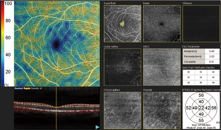 The normative database provides a wide-area, color-coded map comparing the patient’s macular thickness to that of a population of normal eyes. |